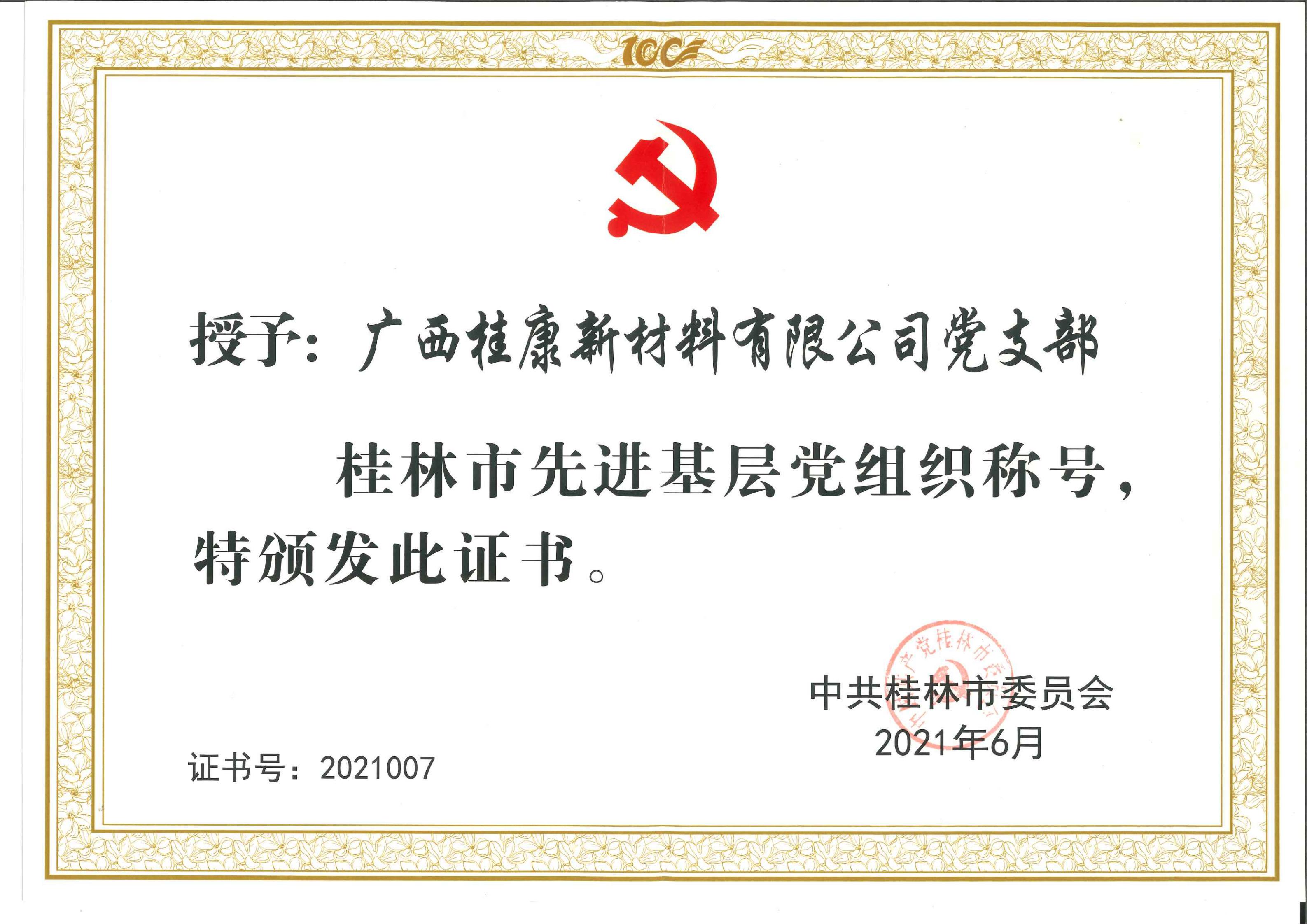 2021年中共桂林市委員會桂林市先進基層黨組織稱號榮譽證書
