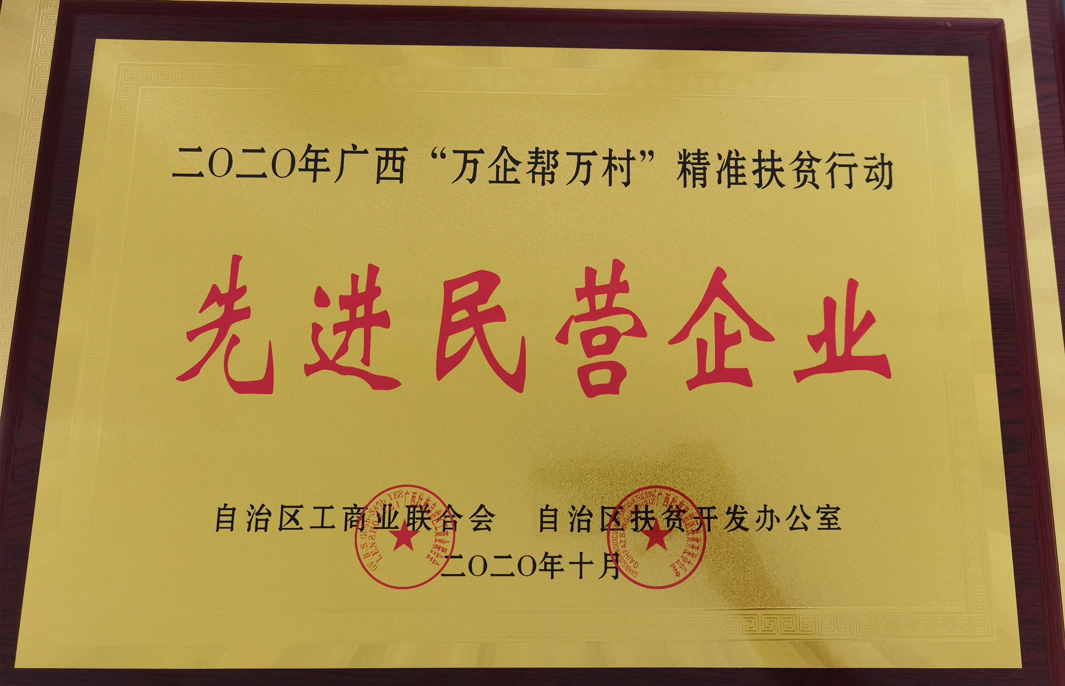 2020年自治區(qū)工商聯(lián)合會、自治區(qū)扶貧開發(fā)辦公室頒發(fā)2020年廣西萬企幫萬村精準扶貧行動先進民營企業(yè)