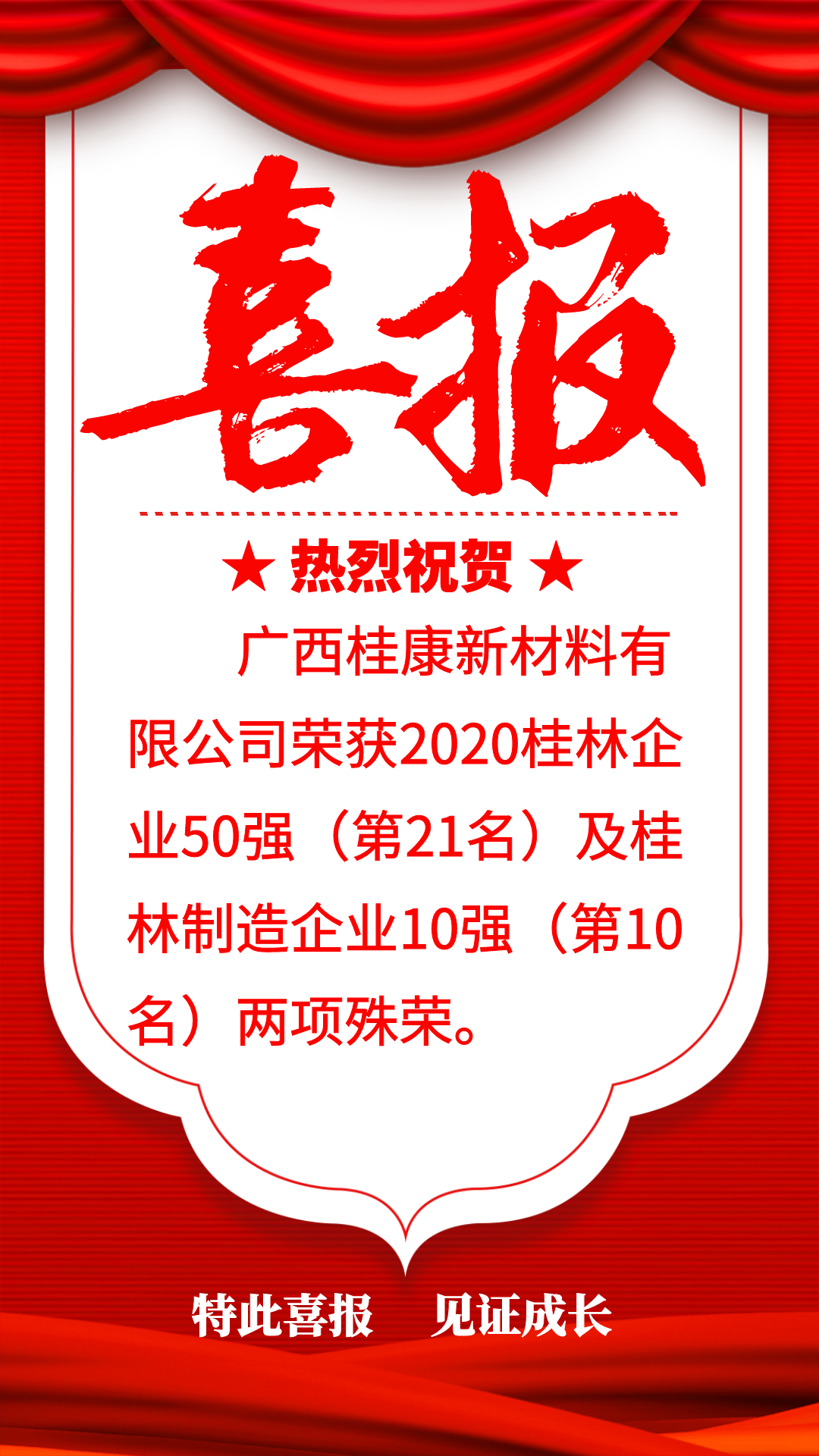 2020年12月17日由桂林市工信局、桂林市工商聯(lián)合會(huì)、桂林市企業(yè)與企業(yè)家聯(lián)合會(huì)共同召開的“桂林企業(yè)家大會(huì)”上,廣西桂康新材料有限公司喜獲“桂林企業(yè)50強(qiáng)”及“桂林制造企業(yè)10強(qiáng)”兩項(xiàng)殊榮。